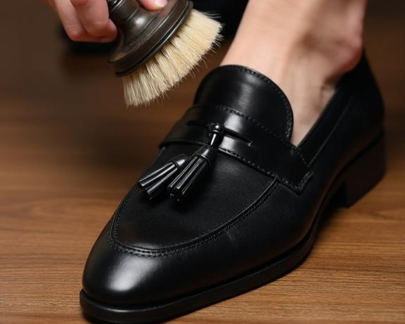 4. Allow the polish to dry for a few minutes, then use a clean cloth or horsehair brush to buff the shoes until they achieve a desired shine.