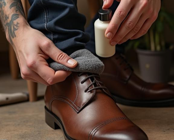 2. Apply a small amount of polish onto a soft cloth or applicator brush and work it into the shoe's leather using circular motions.